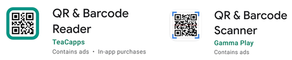 Telefonen må ha et "QR kode" leseprogram. Noen telefonet har det innebygd men alle kan installere et slikt gratisprogram og de vi anbefaler er "QR & Barcode Reader" fra frimaet TeaCapps og "QR & Barcode Scanner" fra firmaet Gamme Play. Du finner dem på Google Play og AppStore. Disse program er ofte bedre enn det innebygde QR programmet.