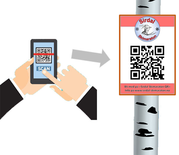 3. Fire plasser i renntrase står det skilter med bilde av en "QR" kode og rennets logo. Disse koder leser/scanner du med mobilen din og så vil et system på internet registrere at du har passert det punkt.
